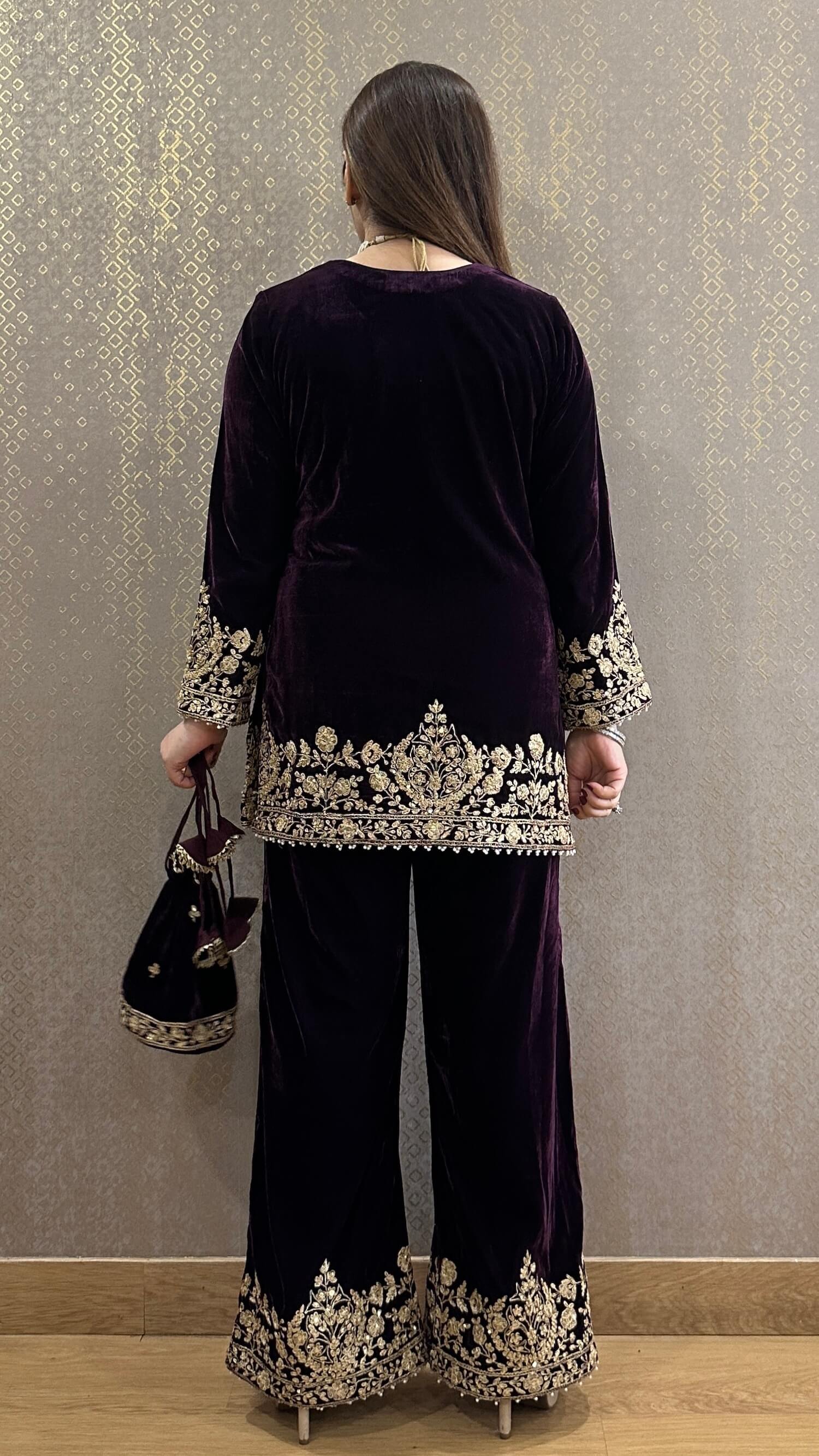 Featuring a hand embroidered co-ord set crafted in our luxurious silk velvet and a potli
